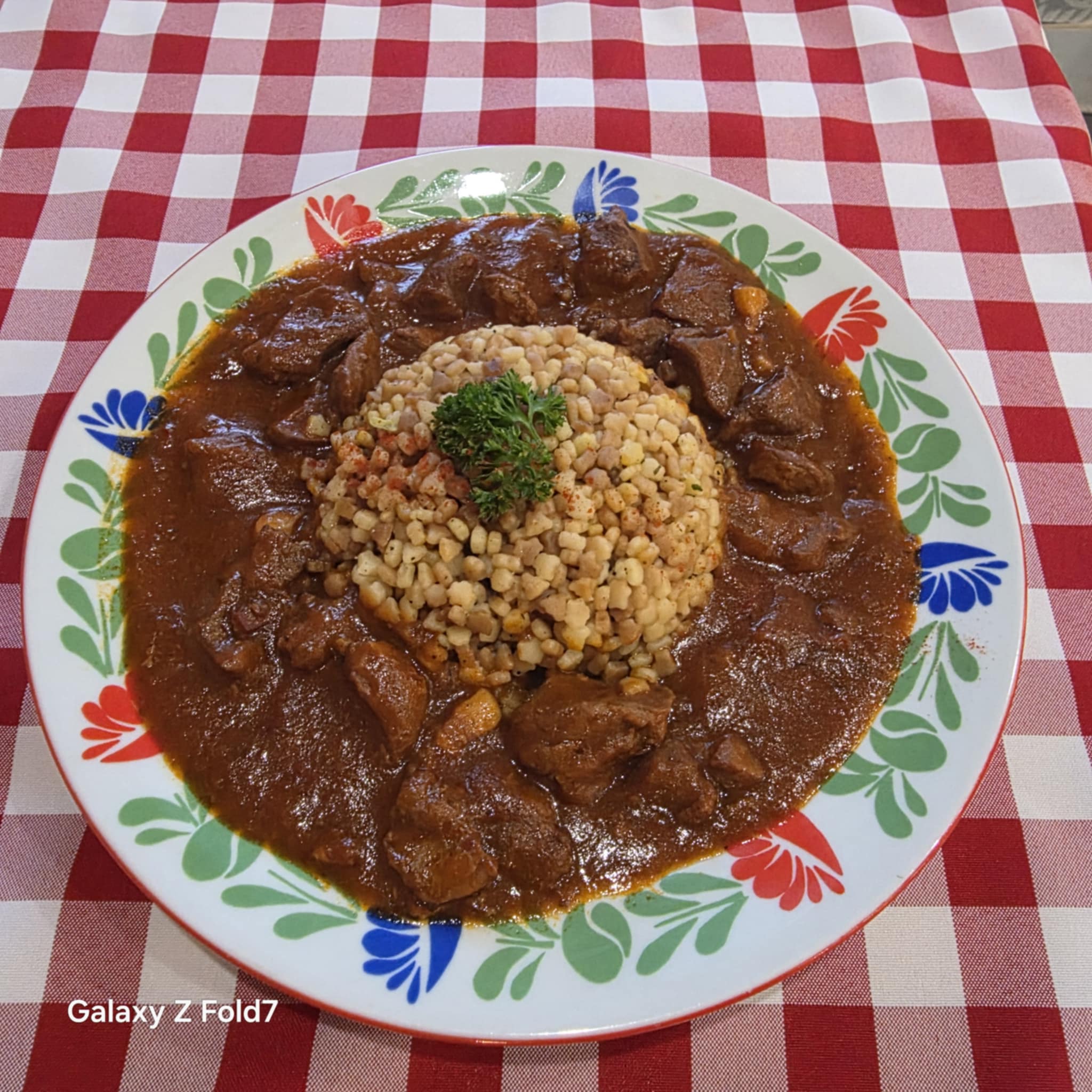 Traditional, slow-braised wild boar meat in a rich, spicy gravy. Its flavour is made even more distinctive with Kolozsvár bacon and smoked sweet bacon, served with egg barley (tarhonya).